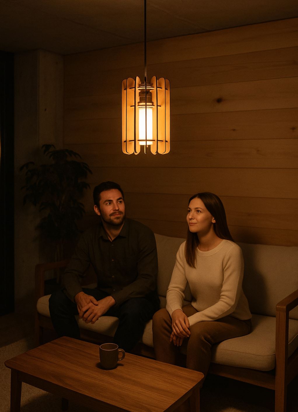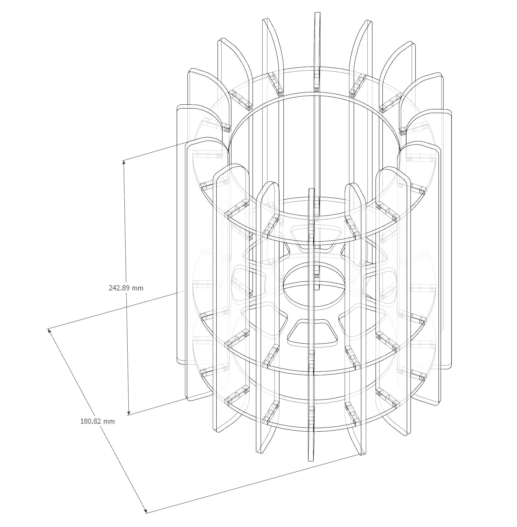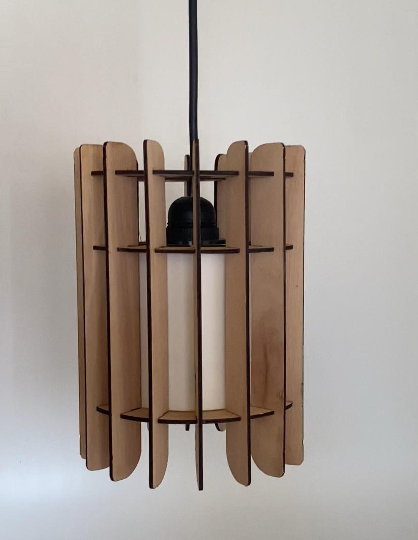Baldaquín PLA impreso 3D, elementos de madera sostenible. Cables y soquetes certificados SEC. Difusor de luz tipo PAI.